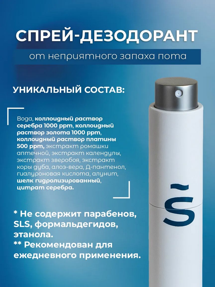 Откройте для себя новый уровень комфорта! Невесомый спрей за счёт уникальной формулы, в отличие от любого антиперсперанта, мгновенно удалит имеющийся неприятный запах пота благодаря силе коллоидного серебра — природного антибактериального компонента, который защищает вашу кожу и дарит ощущение чистоты даже в самые активные дни.
