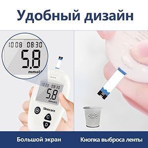 Четкий дизайн большого экрана удобен для пожилых людей, чтобы они могли считывать свои собственные значения измерений после анализа крови, а кнопка извлечения полоски может гарантировать, что вы не заражены полоской для измерения уровня сахара в крови.