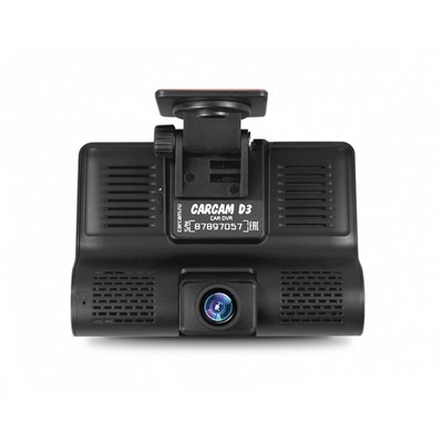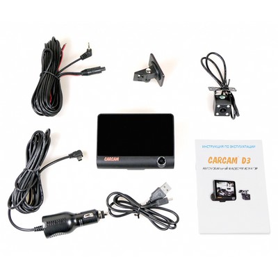 КАРКАМ D3 — автомобильный видеорегистратор, оснащенный сразу тремя камерами, которые позволяют фиксировать обстановку перед автомобилем, позади него и в его салоне. Основная камера, оснащенная стеклянным объективом с углом обзора 140°, ведет запись обстановки перед автомобилем в формате HD 1280×720p. Фронтальная камера с углом обзора в 120° расположена на задней части видеорегистратора и ведет съемку в салоне автомобиля. В комплект входит дополнительная, миниатюрная камера заднего вида с углом обзора 120°, которая может применяться как для фиксации обстановки позади автомобиля, так и для безопасной парковки. IPS дисплей с диагональю 4'', обеспечивает удобную навигацию в меню устройства, а также комфортный просмотр изображения сразу с нескольких камер одновременно.