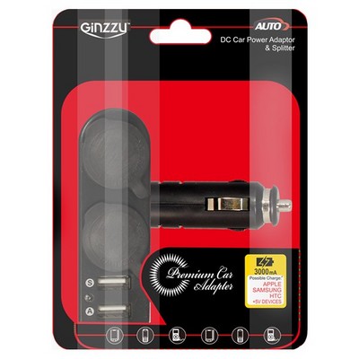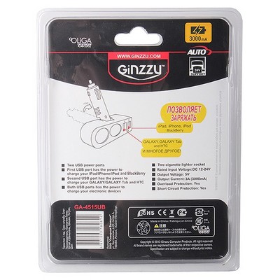 Универсальный разветвитель GINZZU, вставляемый в прикуриватель, надежен и прост в использовании. Более всего он эффективен в качестве зарядного устройства в автомобиле. Встроенные два USB входа уникальны и подходят практически для всех типов устройств, например порт А предназначен для устройств типа APPLE и других, а порт S совместим с телефоном и планшетом типа Samsung Galaxy и подобных. Среди прочих достоинств следует отметить наличие функции индикации питания и предотвращения перегрузки и замыканий. Мощность описываемого приспособления равна 15 Вт.