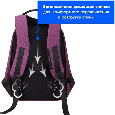 Удобные регулируемые лямки и плотная ортопедическая спинка не дают спине уставать даже после долгого дня на ногах и позволяют воздуху свободно циркулировать между спиной и рюкзаком.