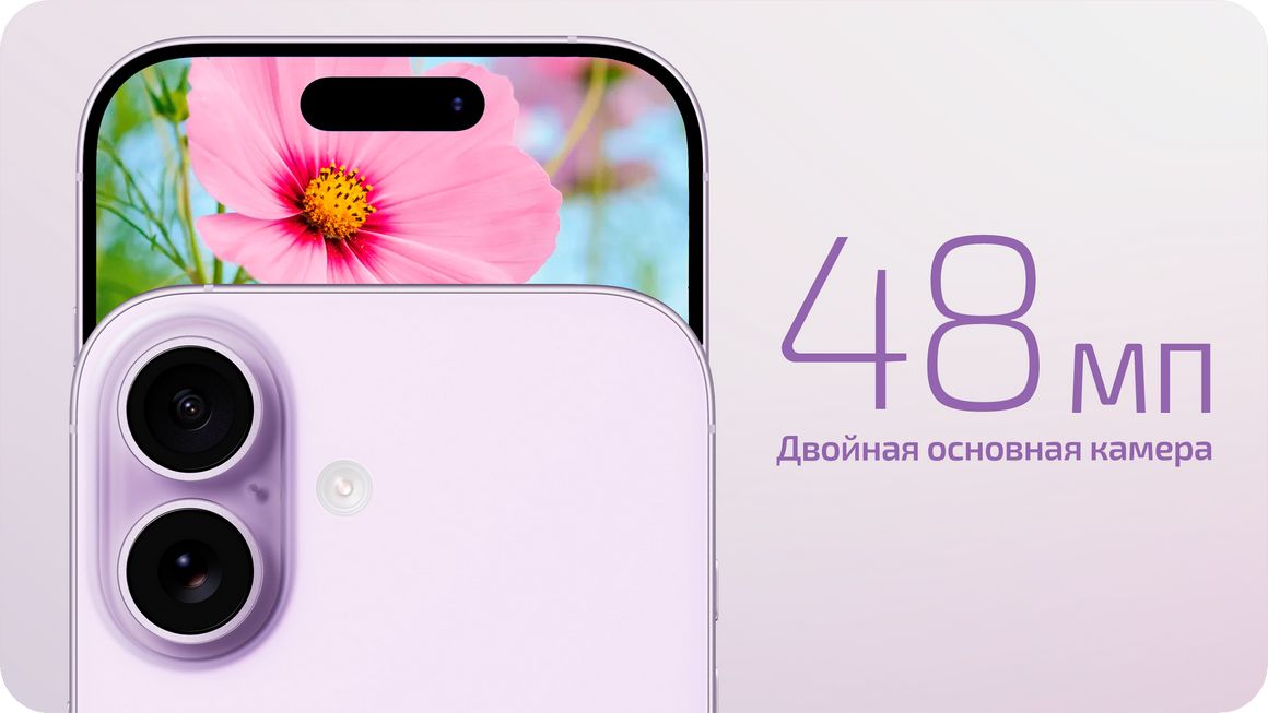 Двойная основная камера iPhone 17 с разрешением 48 Мпикс. позволяет делать отличные снимки, записывать видео в 4K с Dolby Vision, поддерживает съёмку портретов с реалистичным размытием фона и фотографические стили. Более совершенные алгоритмы обеспечивают ещё больше деталей и гарантируют отличный результат в любых условиях. Сверхширокоугольный модуль здесь также отвечает за макро, а стабилизация со сдвигом матрицы делает записанные видеоролики невероятно плавными.