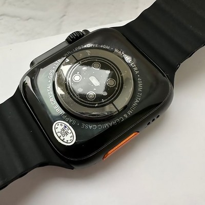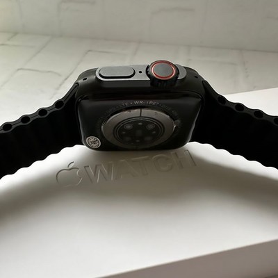 Две функциональные боковые кнопки и колесико.Обратная сторона устройства получила типовую конфигурацию – это магнитные контакты для зарядки и датчик сердечного ритма. Корпус умных часов изготовлен из цинкового сплав, а ремешок доступен в силиконовом исполнении с металлической застежкой ( подходят любые 45mm от Apple).Часы имеют более чем 500 циферблатов а также поддерживают индивидуальные. Часы с влагозащитой , которые можно носить в дождливые дни и не снимать когда моете руки (Внимание! В бассейне или водоёме купаться с ними не рекомендуется!)