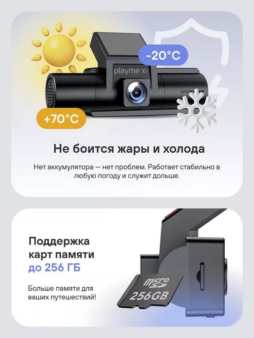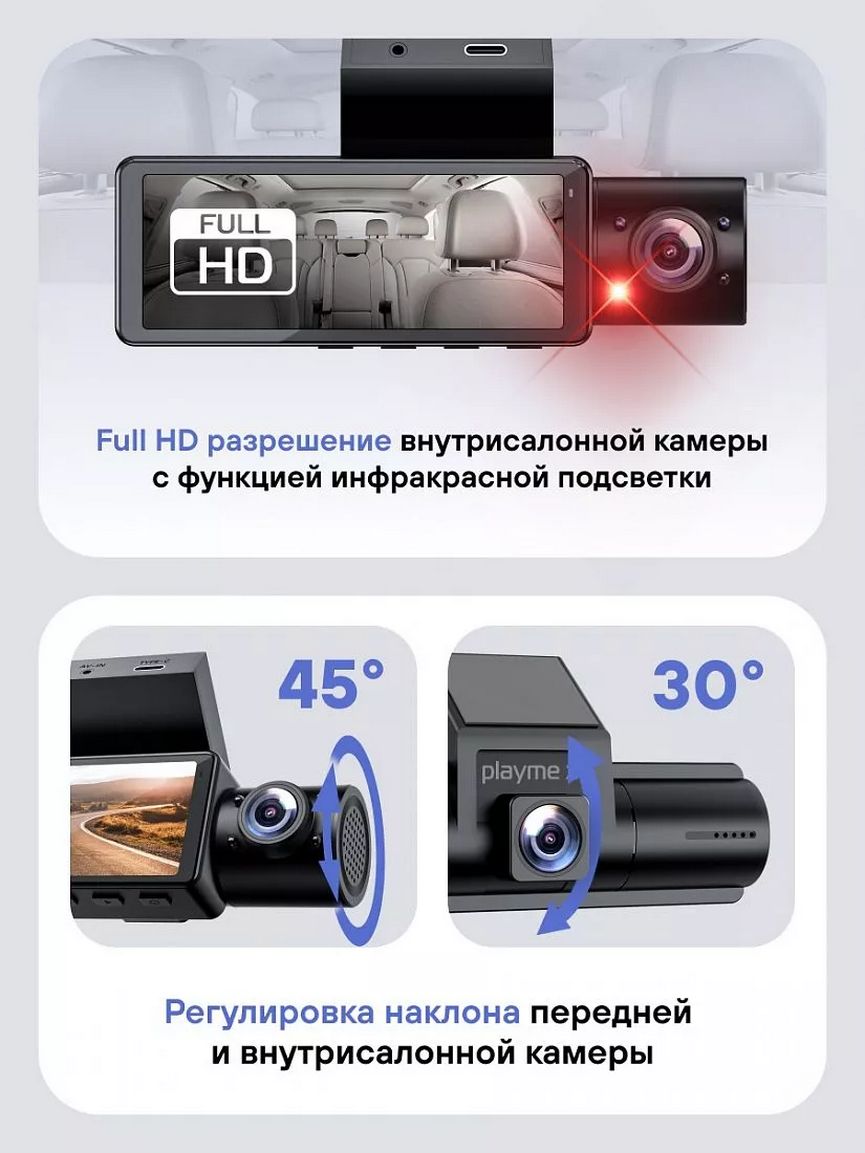 Playme X PRO — это мощный двухканальный видеорегистратор, обеспечивающий полный контроль за дорогой и салоном с возможностью подключения третьей FullHD камеры. Устройство записывает фронтальную обстановку в детальном разрешении QuadHD (2.5K), а салон — в FullHD с ИК-подсветкой для чёткой записи даже ночью. Расширьте зону наблюдения, установив дополнительную камеру на заднее стекло, чтобы фиксировать события позади автомобиля. Благодаря Wi-Fi, большому 3.2-дюймовому экрану и поддержке карт памяти до 256 ГБ управлять архивом и просматривать видео легко и удобно. Функции G-сенсора и датчика движения автоматически сохраняют важные моменты. Надёжность и поддержка трехканальной записи делают Playme X PRO идеальным выбором для всех автомобилистов, включая профессиональное использование в такси и коммерческом транспорте.