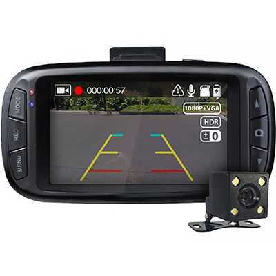 Автомобильный Full HD видеорегистратор с дополнительной парковочной камерой, которая включается автоматически при переходе на заднюю передачу. Процессор Novatek NTK96655, матрица Aptina AR0330 3MP 1/3", угол обзор 170°, задняя камера 140°. Функция HDR (High Dynamic Range) для ночной съемки. Дисплей 2.7", G-сенсор, детектор движения, штамп даты и времени на видео, поторотное крепление со сквозным питанием, аккумулятор 250 mAh.